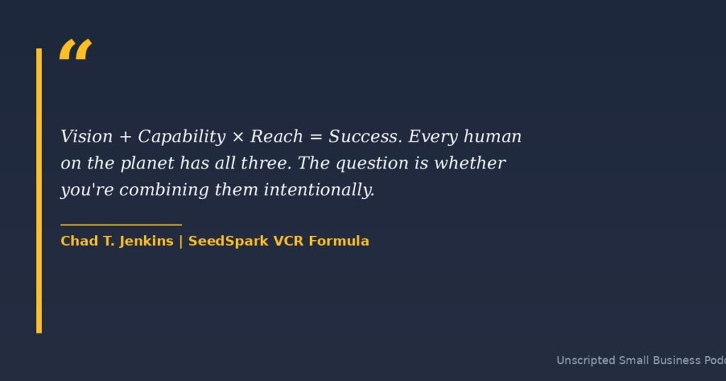 “Vision + Capability × Reach = Success. Every human on the planet has all three. The question is whether you’re combining them intentionally.” — Chad T. Jenkins | SeedSpark VCR Formula